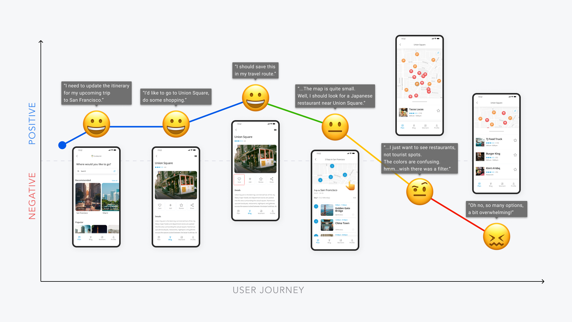 I conducted user journey mapping to identify the positive and negative aspects of the users' journey and determine where to focus my design efforts.