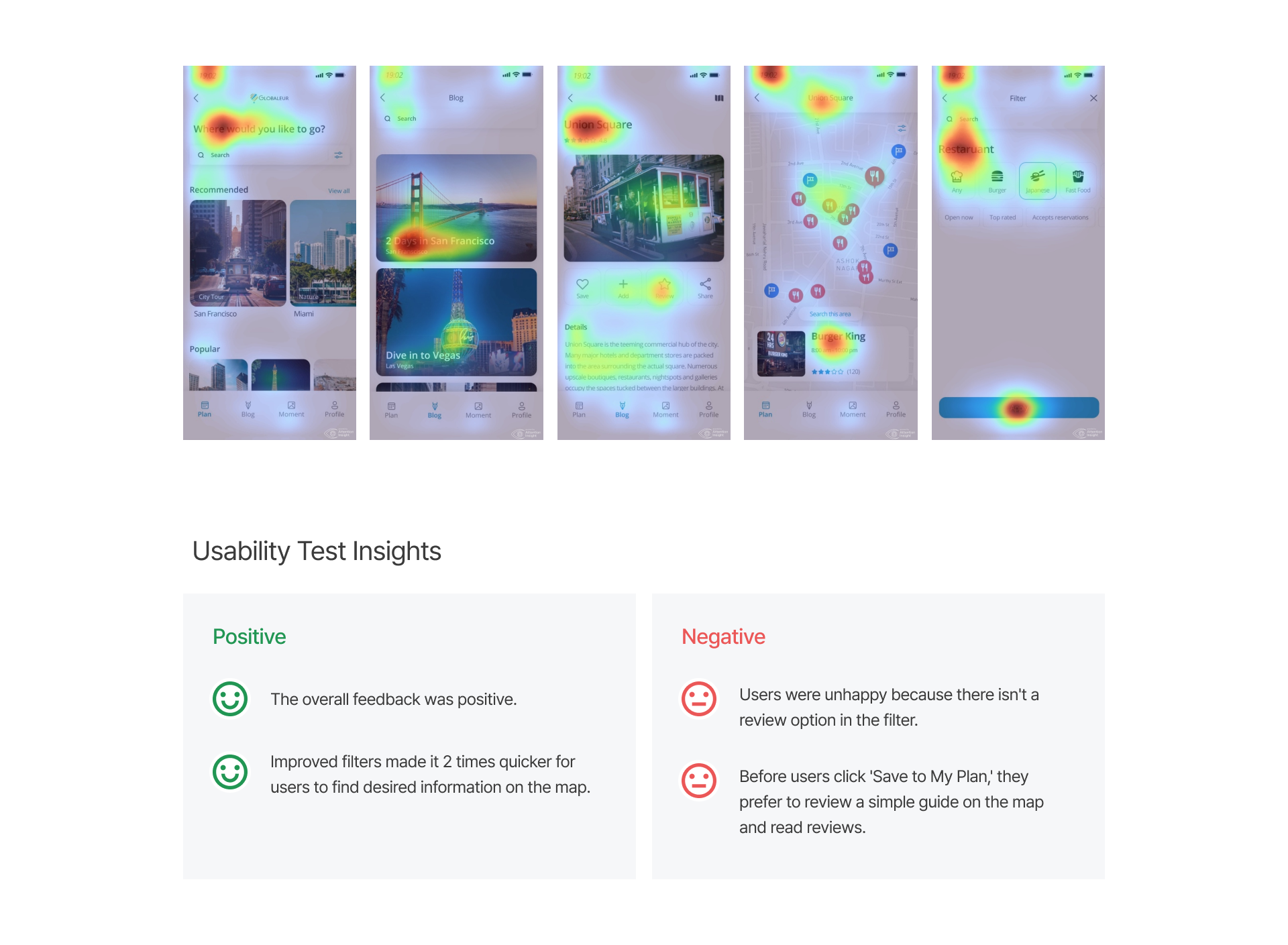 I conducted usability testing with three participants to gather feedback. Overall, users found the improved filters made finding information twice as quick. However, they were unhappy about the lack of a review option and preferred to check a simple guide and read reviews before saving to their plan.