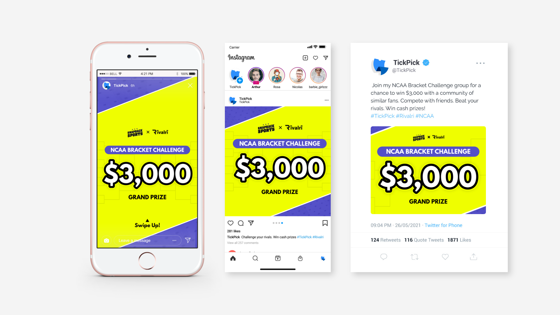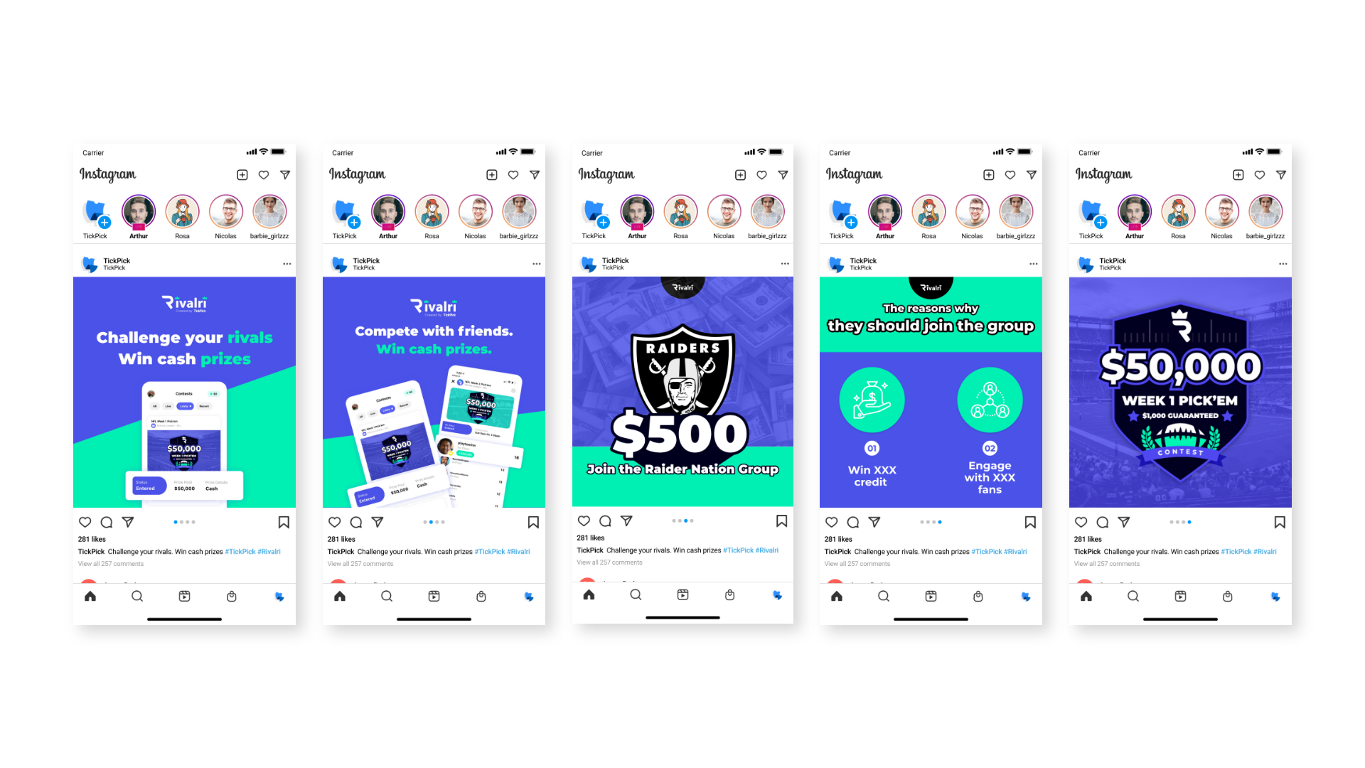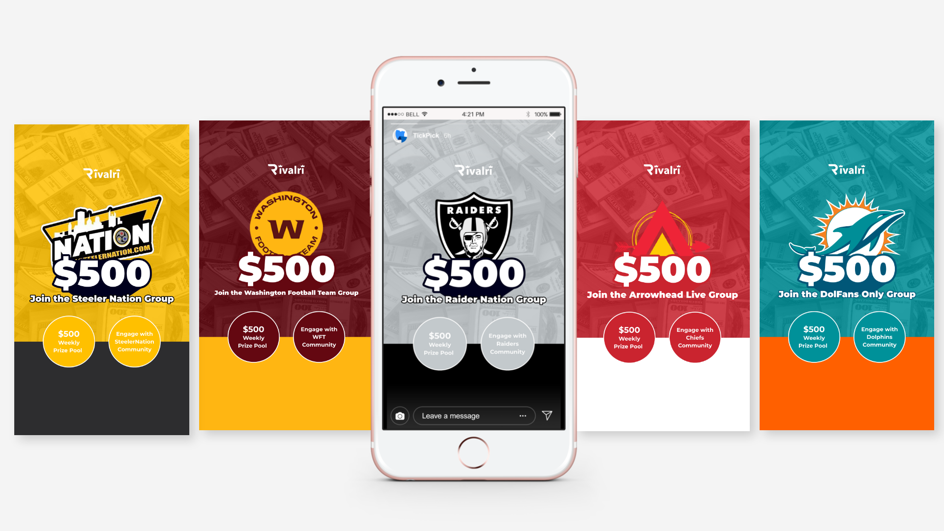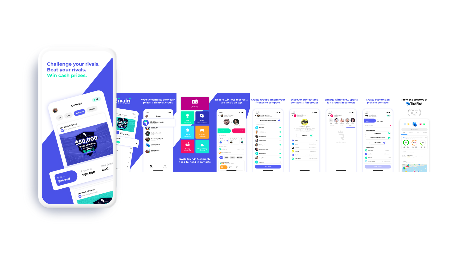 Rivalri is TickPick's sports betting competition game platform. Our goal was to create a game app for sports fans to connect. I designed the app's look and feel, including the logo, colors, icons, UX/UI, prototypes, and SNS content banner designs.