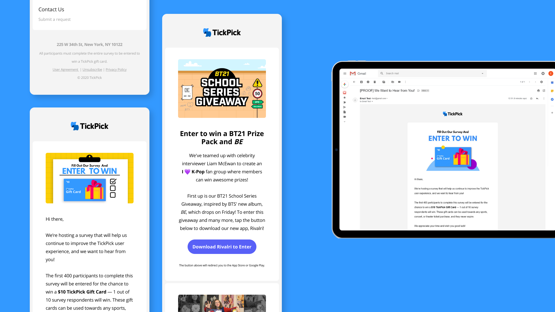 I was involved in planning and designing TickPick's email templates and collaborated with a copywriter to craft the content. I utilized tools like Illustrator, Photoshop, Adobe XD, and After Effects to create essential design elements. My main objective was to create visually captivating email designs that would captivate customers and sustain their interest. Additionally, I focused on revising the content to be concise, witty, and engaging to prevent it from becoming tedious.