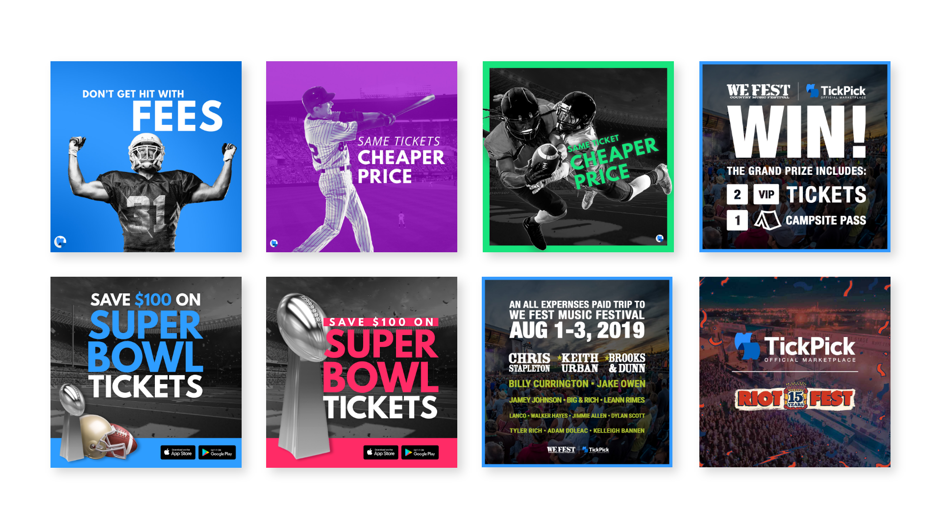I created TickPick's social media design using friendly 2D illustrations and photos. By incorporating simple and clean graphic elements along with TickPick's vibrant primary colors, I aimed to make it eye-catching, fun, and approachable. In particular, I introduced moving elements for giveaways and price comparisons, enhancing user engagement with bright, distinct colors and graphics, and further strengthening TickPick's unique branding.